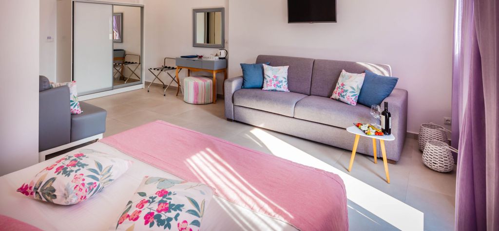 Junior suites provide one double or two twin beds (upon request), sitting area, bathroom with shower, private balcony or terrace. Accommodates up to 3 guests. Size approx. 20 – 25 sq.m